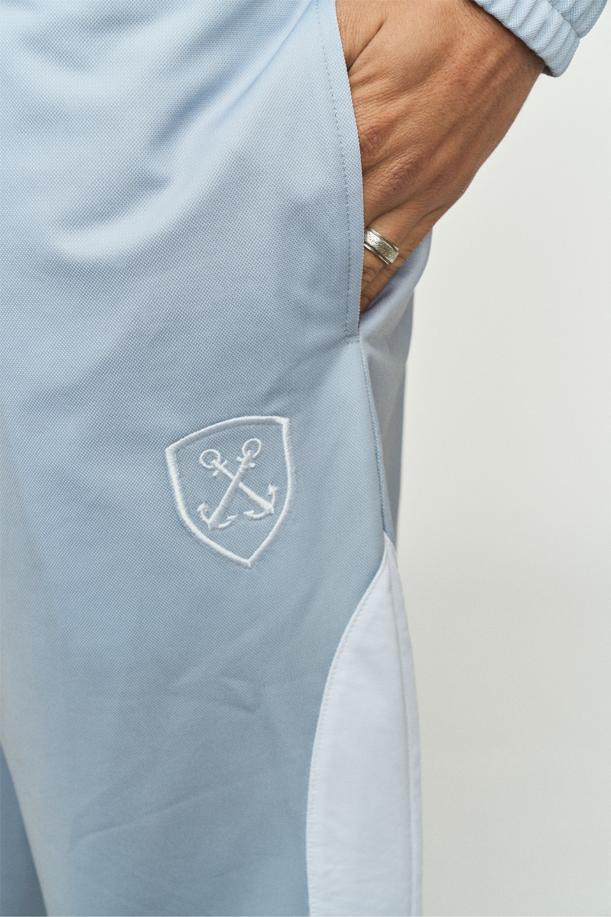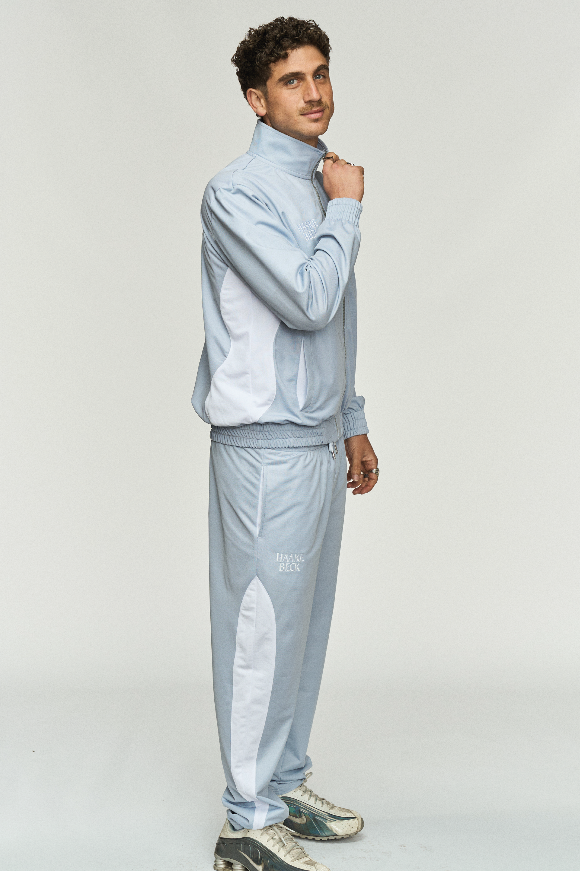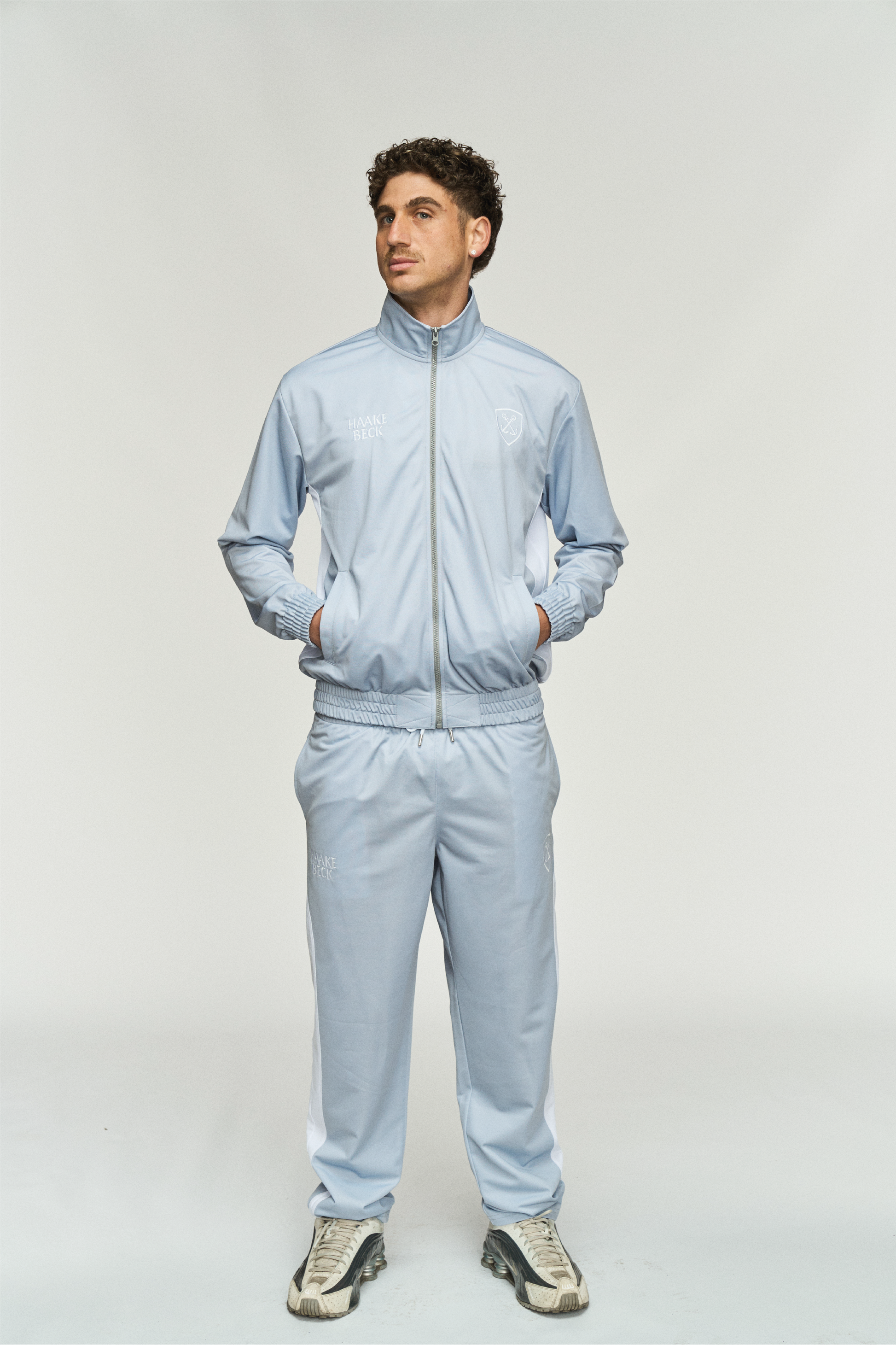 Ein neuer Haake-Beck-Trainingsanzug – dieses Mal in Grau. Der lockere Schnitt und die weißen Elemente erinnern an Sportanzüge aus den frühen 2000er-Jahren.